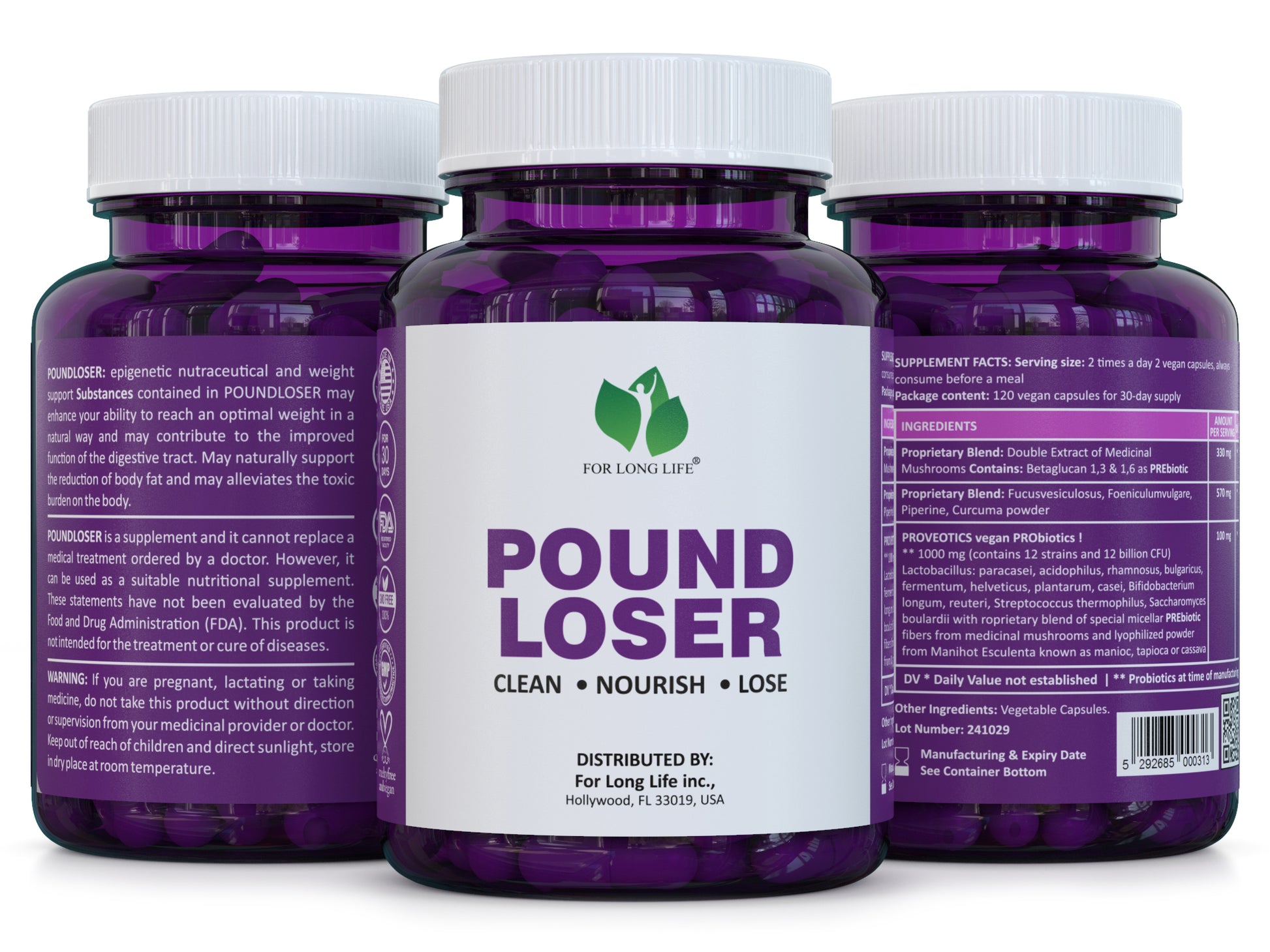 POUND LOSER is an advanced epigenetic nutraceutical that supports sustainable weight management by improving gut health, nutrient absorption, and metabolic balance—without aggressive dieting or the typical yo-yo effect. Its formula combines medicinal mushroom extracts, dietary fibers, and essential micronutrients to restore microbial balance, reduce fat storage, and naturally regulate appetite.
