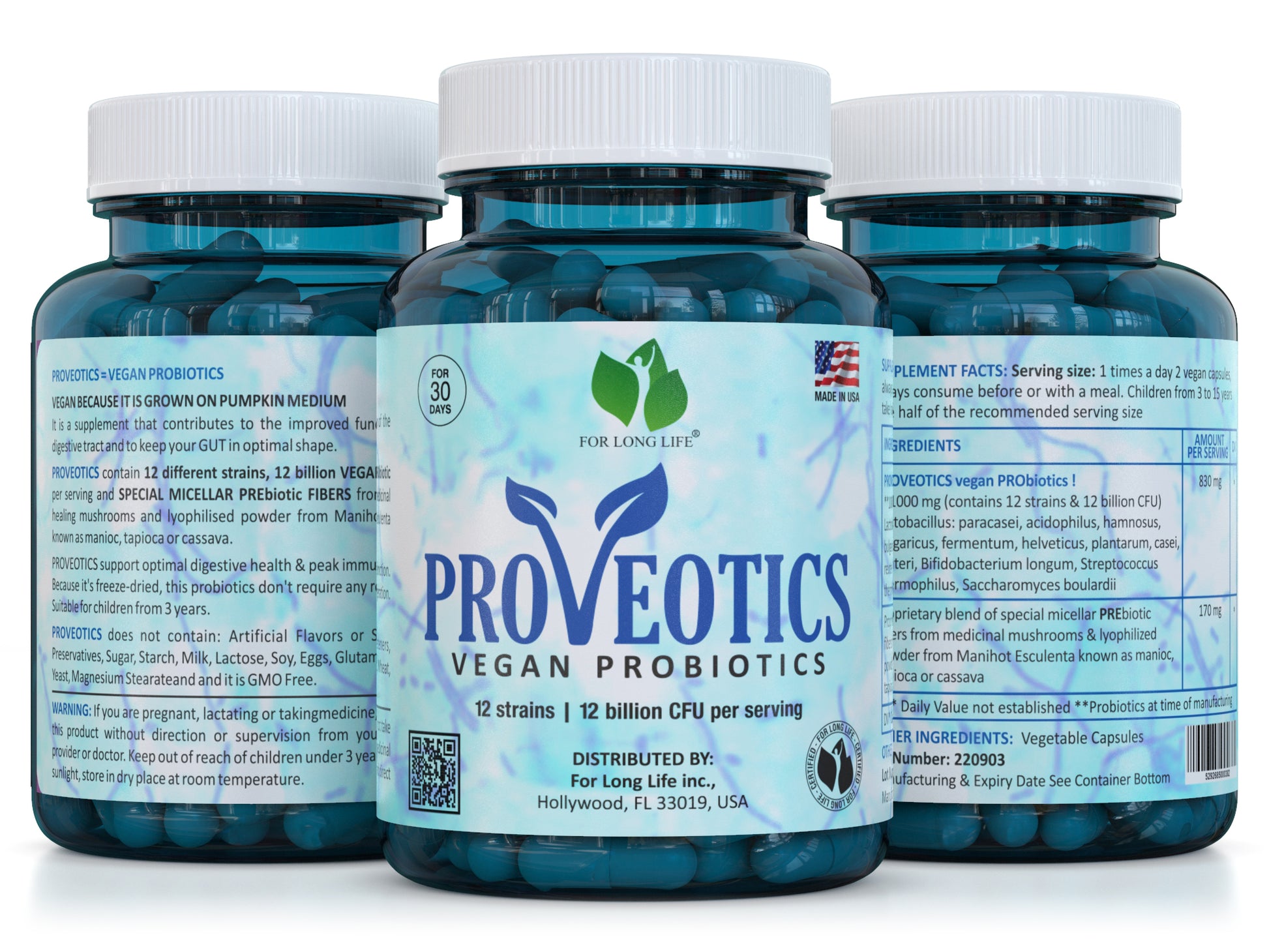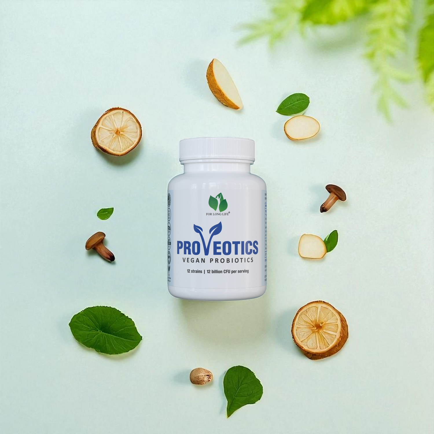 The gut microbiome plays a central role in digestive health, immune regulation, and even mood balance. PROVEOTICS combines 12 synergistic strains, including Lactobacillus rhamnosus, Bifidobacterium longum, and Saccharomyces boulardii—species studied for maintaining healthy microbial balance and supporting immune defenses. The addition of micellar prebiotic fibers from medicinal mushrooms and Manihot Esculenta provides nourishment for beneficial gut flora, enhancing colonization and function. Enteric coating improves survival through gastric acid, while freeze-drying maintains stability without refrigeration. This makes PROVEOTICS a science-driven, high-quality supplement for daily gut support.